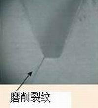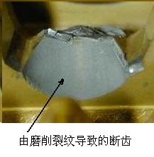 问题三、涂层滚刀的复磨和复涂工艺过程注意事项 1、 复磨和褪涂的工艺过程是:首先是褪掉上次的涂层,再磨除前刀面和后刀面的磨损,然后复涂层。 2、 注意此工艺过程不能颠倒! 3、 假如带涂层滚刀不褪涂直接复磨,因为涂层和滚刀基体的热传导率不同,基体材料传导热快,受热后体积容易胀大;而涂层都是阻热材料,热传导率差,热传导慢。这样,已磨损的滚刀前刀面和后刀面基体外露部分,已无涂层,和还存在涂层的部分;在磨削时,造成两部分的热传导不均匀,膨胀不均匀,容易造成热局部集中,基体材料组织内产生热应力释放,局部容易产生微细热裂纹,尤其是在滚刀齿根圆弧部位。目前,褪涂层的方法是使用化学药水浸泡法,把刀具上涂层化学反应褪除。如果滚刀上存在微细裂纹,药水容易进入微细热裂纹中,对基体长时间(一般浸泡时间都在1小时左右)作用后,会腐蚀基体,造成裂纹扩展,或出现基体钴元素析出,造成钴流失。物理涂层(PVD)温度是在500℃左右,进炉时间约10小时,如果滚刀上存在微细裂纹,在高温长时间作用下,裂纹处容易扩展和存在相反方向的排斥应力。这样,滚刀在滚切过程中,容易出现掉齿、崩刃、打刀等损坏问题。见下图。